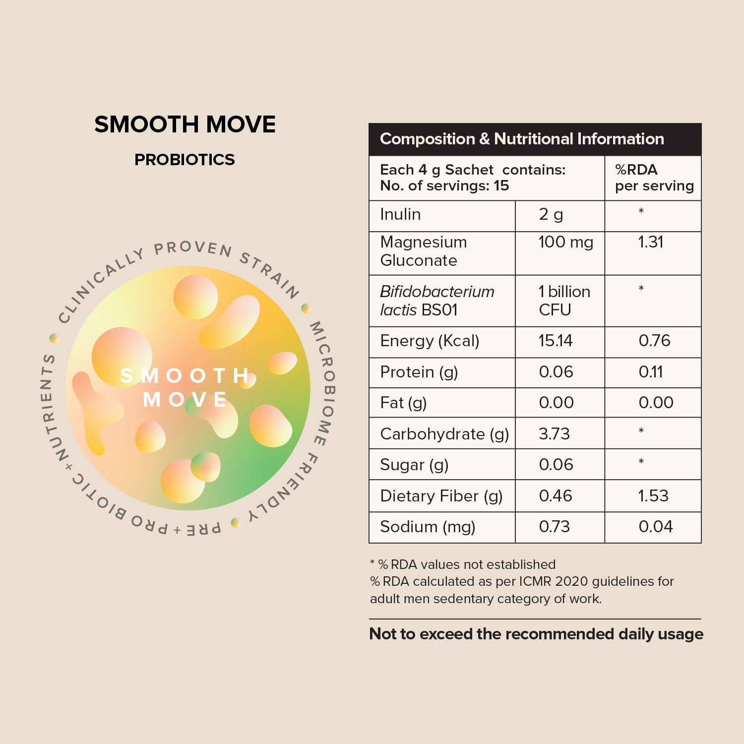 Start with half a scoop of Smooth Move Fiber Boost and 1 sachet of Smooth Move Probiotic sachet dissolved in 200 ml of water daily for the first 5 days. Then, increase the dosage of the fiber to one full scoop per day. For best results use daily.