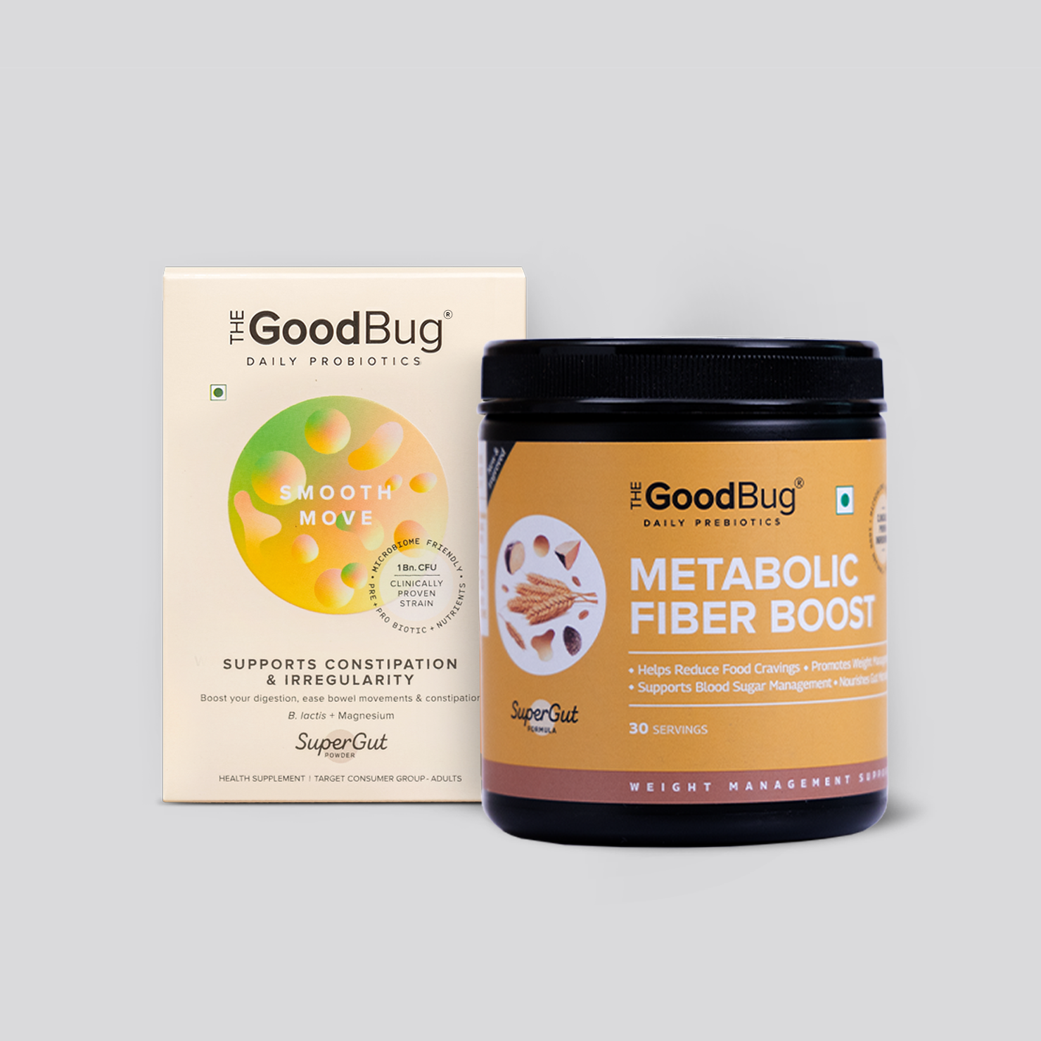 Our Constipation Relief Bundle, featuring Smooth Move Probiotic and Smooth Move Fiber, offers a comprehensive solution for relief from constipation.