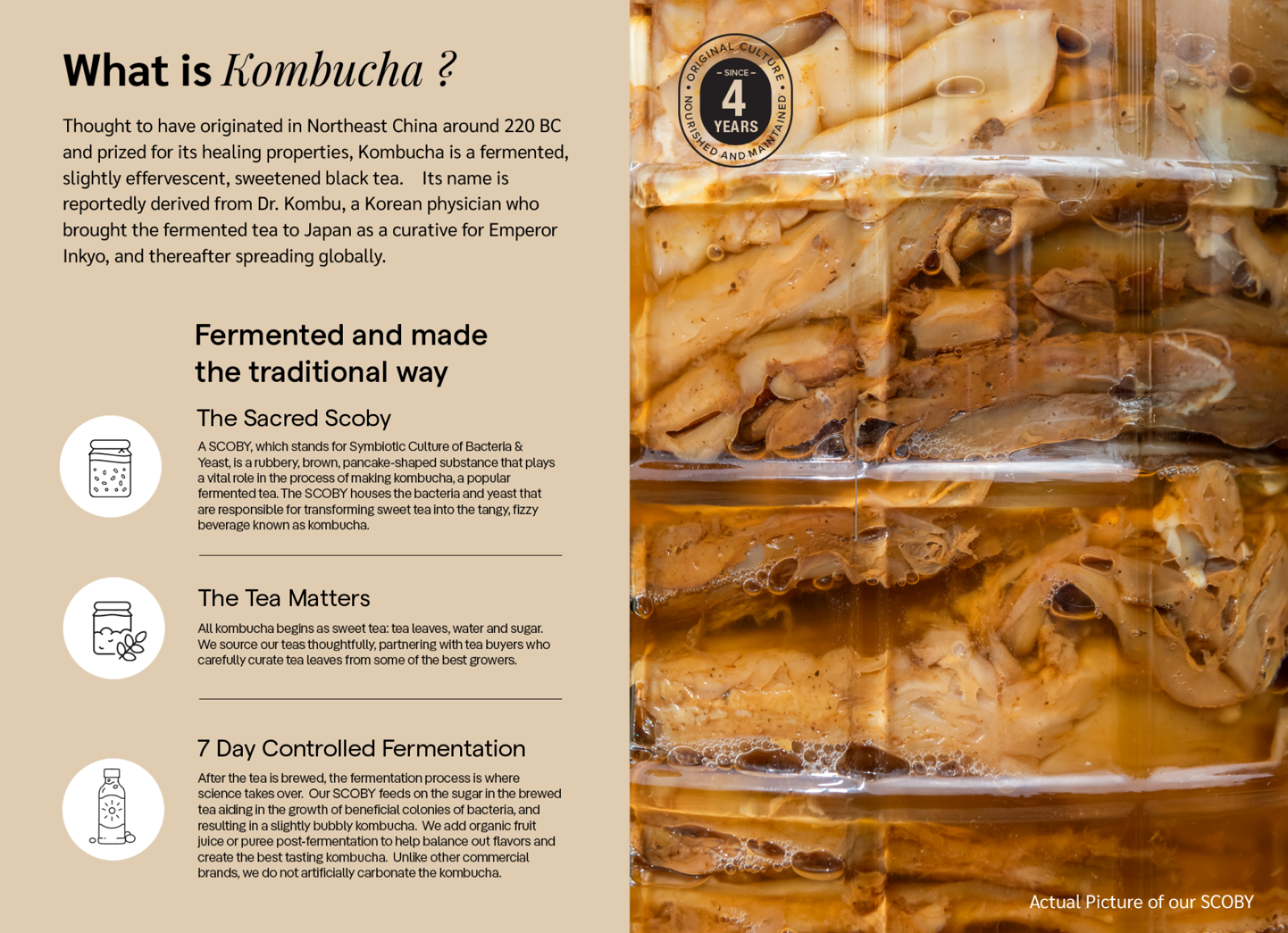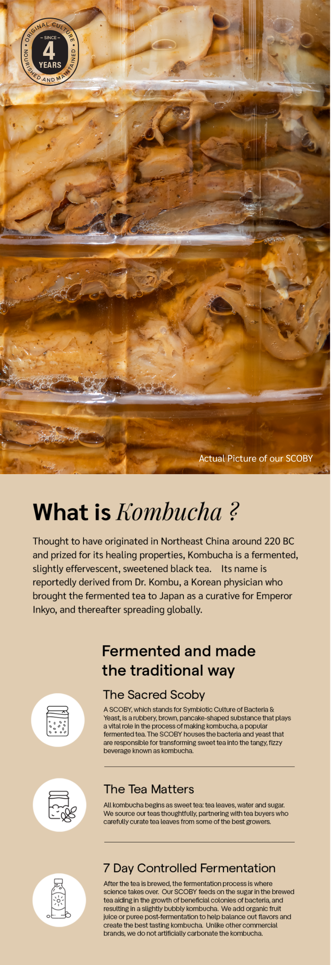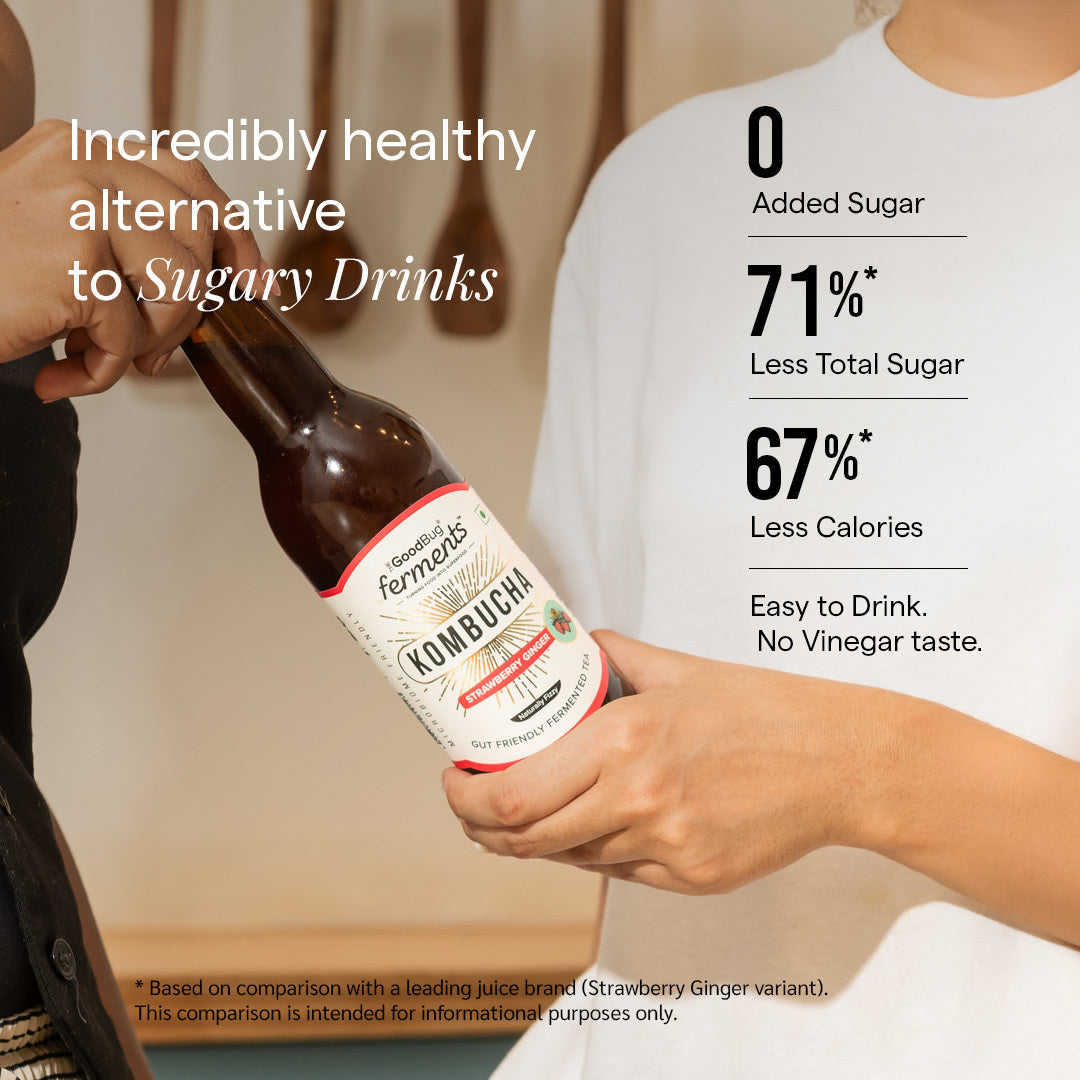 Kombucha is a natural source of probiotics, derived from its live bacterial and yeast cultures (SCOBY), which aid in balancing the gut microbiota and improving digestive health.Reference-Chong, A.Q., et al. (2023). Microorganisms, 11(5), 1344.