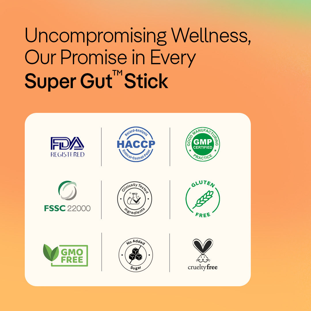 Disbalance in gut microbiome is the root cause of these symptoms. Our synbiotic formula with clinically proven strains, Smooth Move SuperGut stick will help restore that lost balance, correct overall gut health and aid in constipation relief.