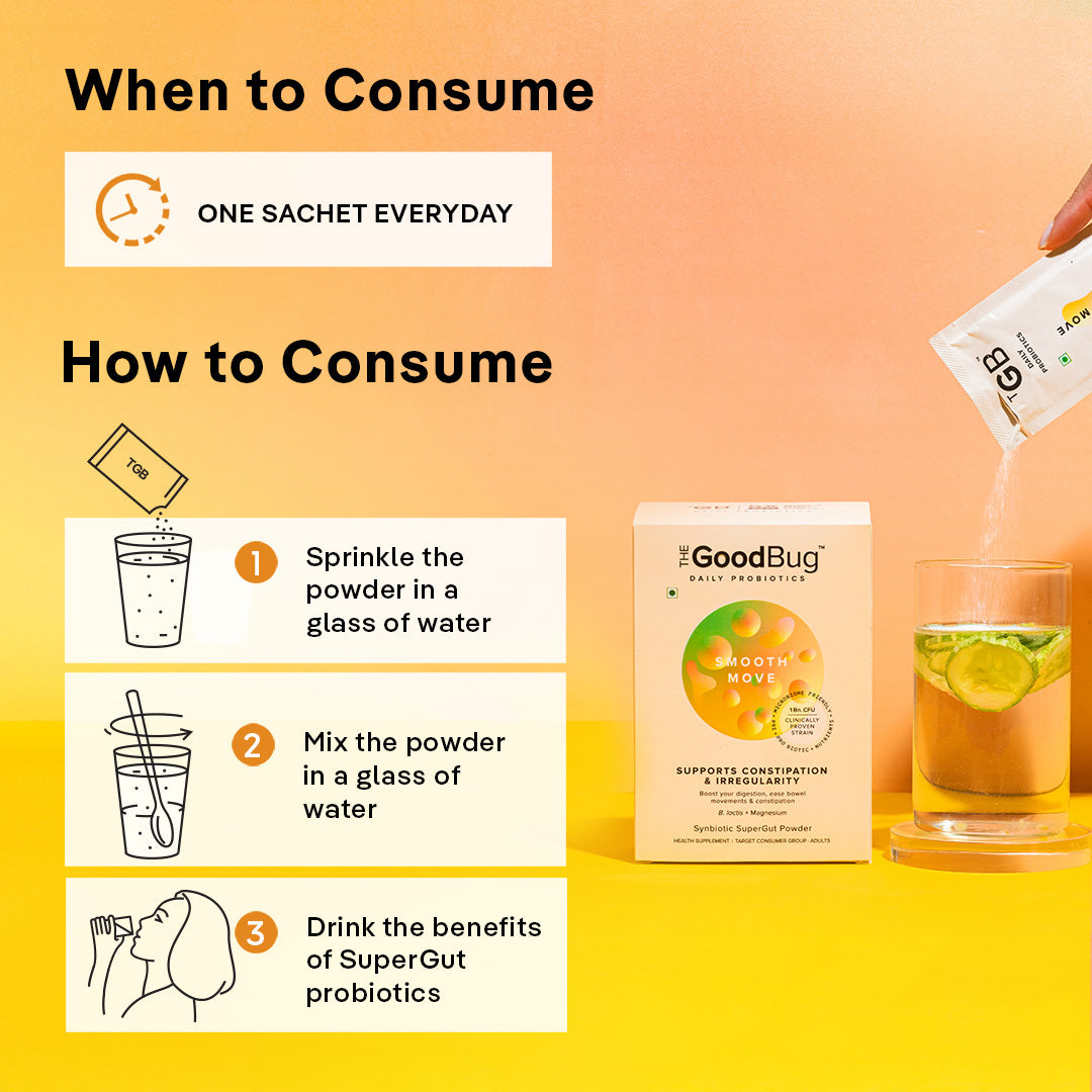 You can mix the lemon-flavoured smooth move supplement in 200 ml of room temperature water and drink it. Do not mix the supplement in any hot beverage as it will kill the probiotics (live bacteria) and might not be as effective as desired.