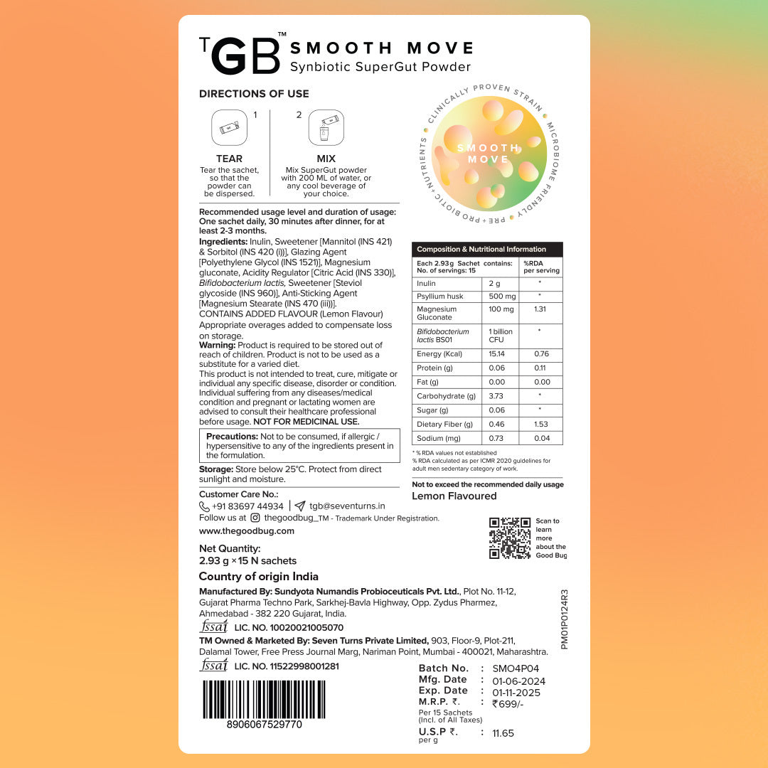The Good Bug’s Smooth Move should make it more comfortable to pass stool. The probiotics, fibres, and magnesium gluconate together alleviate constipation, make your stool soft, and relax your bowel muscles to make passing stool easier.